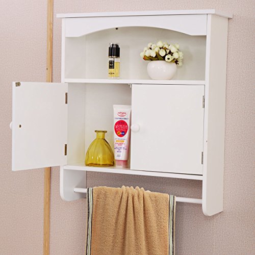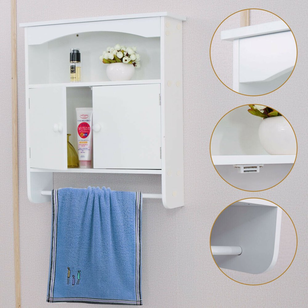 Homfa bathroom wall cabinet, over the toilet space saver storage cabinet kitchen medicine cabinet doule door cupboard with adjustable shelf and towels bar, white. Costway wall mount bathroom cabinet storage organizer medicine cabinet kitchen laundry white\grey. The wall cabinet is designed to hang on the wall, which saves floor space. This storage cabinet is a perfect storage solution for your home, office or hotels. This wall mounted cabinet has a hardware made of stainless steal and is finished with durable, painted mdf, available in white or espresso finish. D bathroom storage wall cabinet with towel bar in antique white: Costway wall mount bathroom cabinet storage organizer medicine cabinet kitchen laundry white\grey. This cabinet features a top shelf and a solid, wide towel bar. Costway wall mounted bathroom medicine cabinet storage cupboard w/ towel bar. Wall cabinet in distressed white: Make the most of your bathroom walls with this wall mounted bathroom storage cabinet. Costway wall mounted bathroom medicine cabinet storage cupboard w/ towel bar. Sold and shipped by costway.